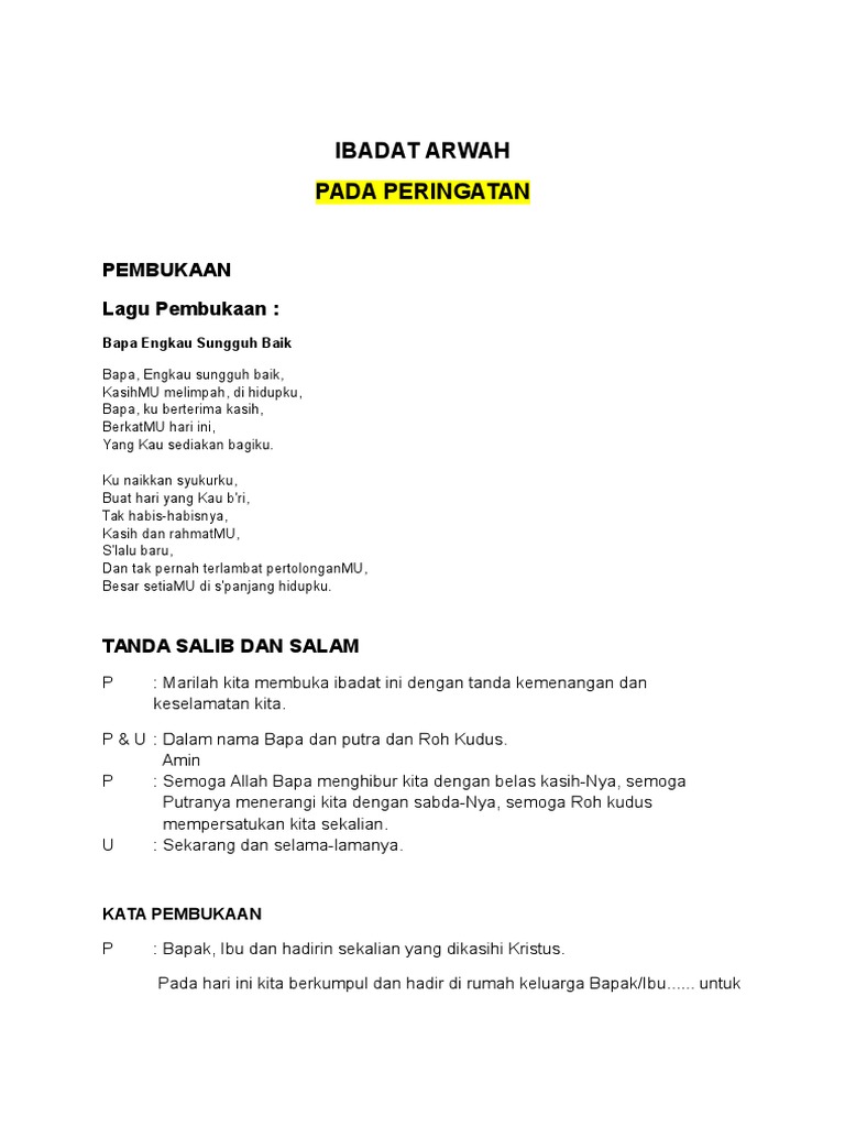 Ibadat Peringatan Arwah Hari Ke- Bagi yang diberi mandat untuk membacakan doa katolik untuk orang yang telah meninggal dunia atau doa arwah 1 tahun 3 bulan 7 hari atau 100 hari dan bagi yang bingung untuk merangkai kata dan kalimat silahkan baca contoh doa berikut ini. Berikanlah istirahat kekal kepada mereka dan kepada semua saudara yang meninggal dalam Kristus. Marilah kita awali doa kita dengan menyanyikan lagu pembuka.